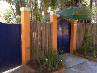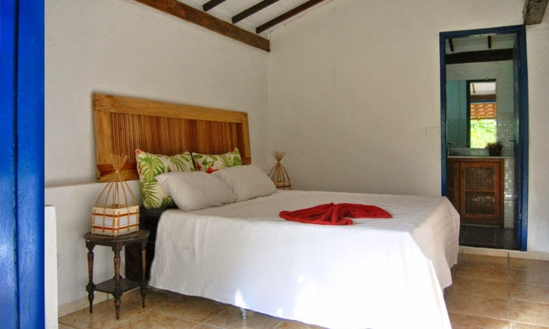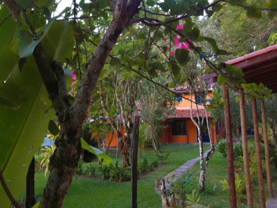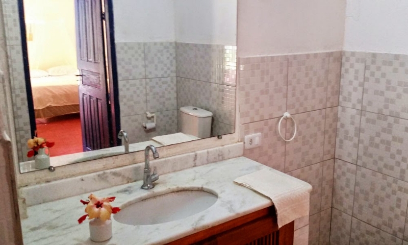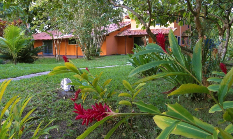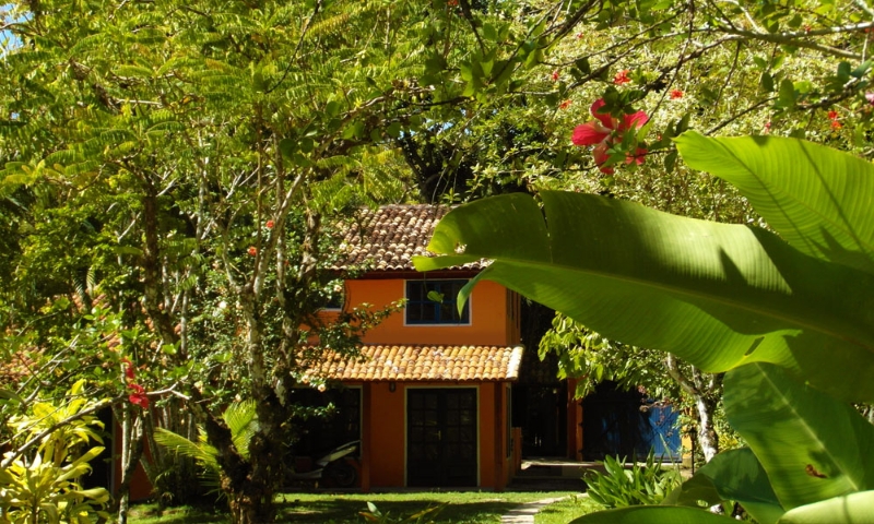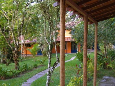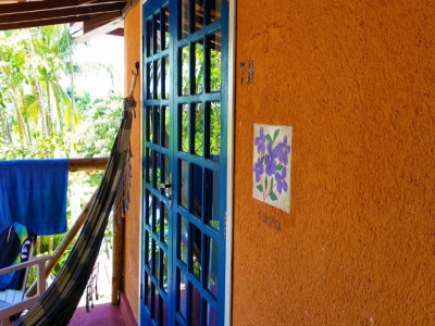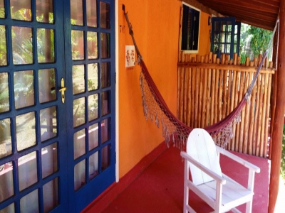 As quatro suÃtes no piso térreo do Villa Populi com vista para o jardim tropical com piscina . Quartos confortáveis com casa de banho privativa e varanda com mesa, cadeiras e rede.